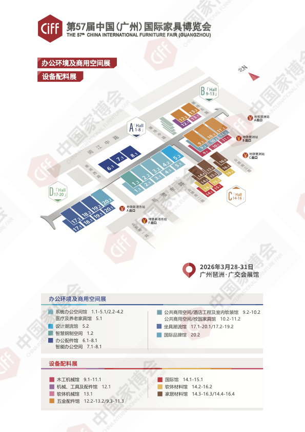 創始於 1998 年,中國廣州國際家具博覽會已經成功舉辦了 55 屆展會。CIFF 廣州家具展在業界享有”亞洲家居交易中心”的美譽,參展廠商更盛讚本展為世界舞台,在全球擁有絕無僅有的影響力與號召力,本展始終致力於打造全球最具價值的家具與家居行業貿易平台,其規模之大,參展商和專業觀眾之多,展品種類之全,展覽品質之高,領銜全球家具展。各個館區主題,詳見攤位圖。